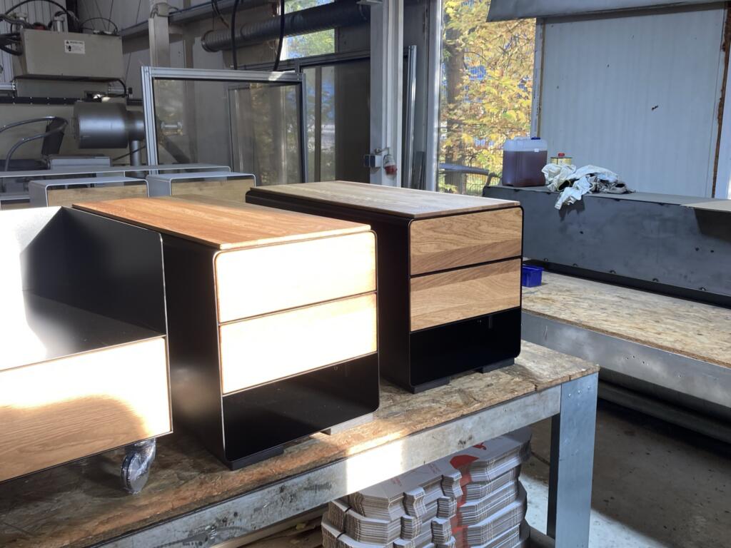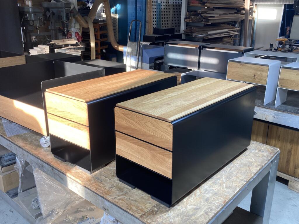 Die Basis für jedes unserer Werke ist massiver Qualitätsstahl, dessen Oberfläche wir nach Ihren Wünschen ölen oder pulverbeschichten. Kombiniert mit charakterstarkem Massivholz, veredelt mit Hartwachsöl, entsteht ein Dialog der Materialien. Jede Schublade, jede Tür und jedes offene Fach wird exakt nach Ihren Vorgaben geplant und umgesetzt – funktionale Details sind dabei ohne Aufpreis möglich. So wird aus einem Entwurf ein handfestes Meisterstück.