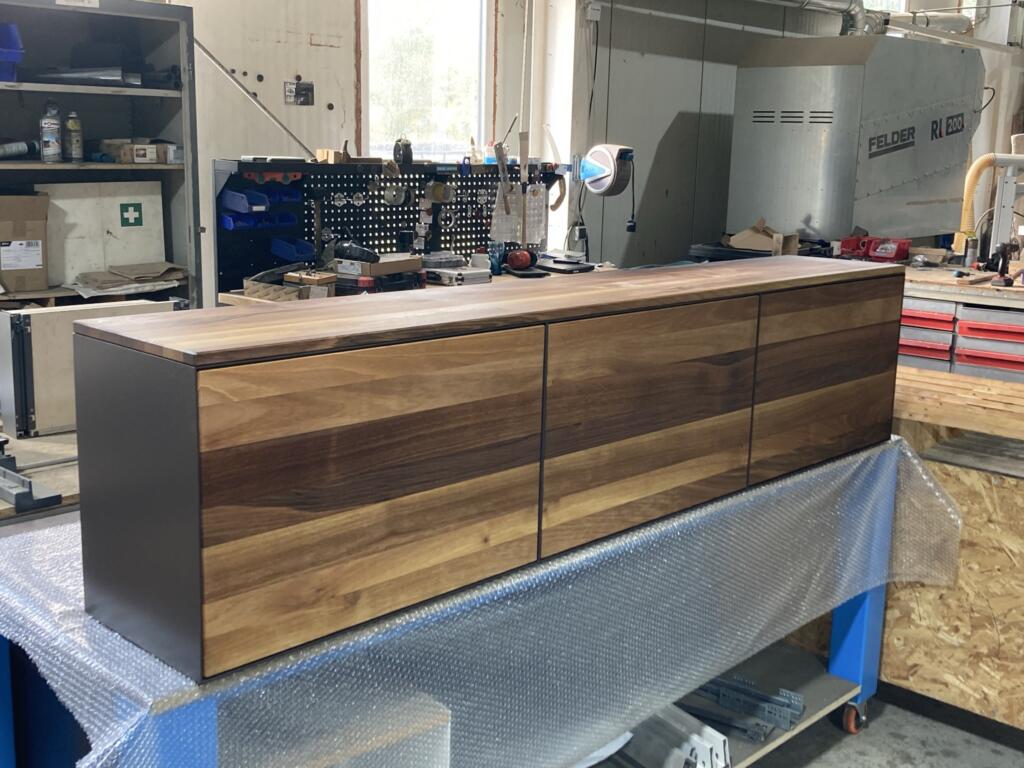 Unsere Kommode hat ihre Reise von der Manufaktur über Karlsruhe bis zu uns nach Italien gut überstanden – und wir sind schlichtweg begeistert. Wir haben die Sitzbank in 200 cm Breite mit europäischem Nussbaum und dem Stahlkorpus in Graubraun (RAL 8019) bestellt.