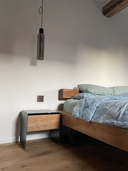 Wir verarbeiten 3mm starken Stahl – deutlich massiver als der Industriestandard. Das hohe Eigengewicht garantiert absolute Standfestigkeit ohne Kippeln. Die Oberfläche aus Zunderstahl (Rohstahl) zeigt authentische Walzhaut, Hitzespuren und Schattierungen, die beim Abkühlen im Stahlwerk entstehen. Kombiniert mit der 2cm starken Front aus geölter Wildeiche entsteht ein unverwüstlicher Material-Kontrast. Jeder Nachttisch wird in unserer sächsischen Manufaktur von Hand gefertigt.